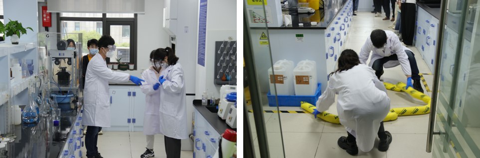演练开始前实验室安全管理办公室谢余凤主任主持召开了启动会议,资产与实验室安全管理处张义副处长作动员讲话,详细介绍演练有关注意事项,并邀请专业工程师讲解了演练流程。演练在先进材料楼309实验室进行,现场模拟实验室少量浓硫酸泼洒灼伤事件、实验室大量有机废液泄露事件两个场景,从事件发生、人员应急救治和疏散撤离、事件上报、处置方案确定、个人防护和物资准备到现场处置与恢复,进行了多环节、全过程的沉浸式演练。
