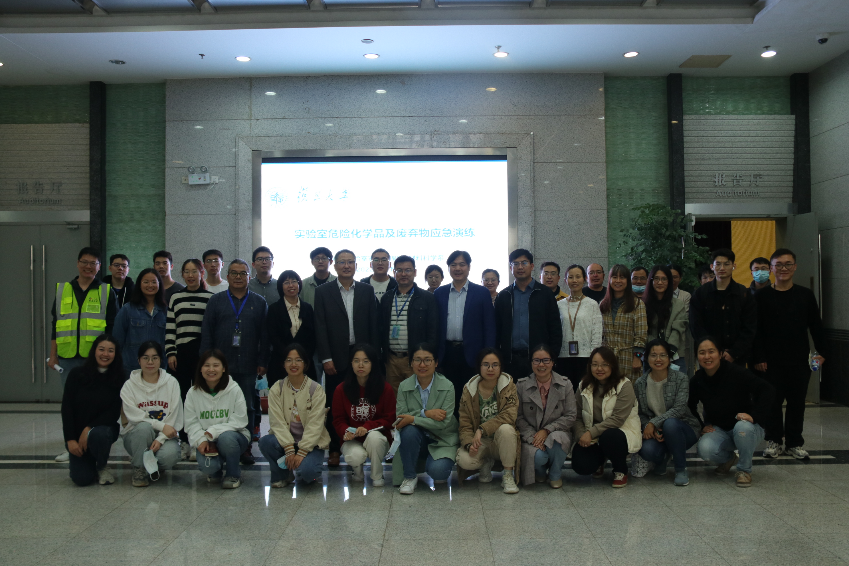 为积极响应首届上海高校“实验室安全月”活动,强化我校化学类实验室安全风险防范应对,有效预防、及时控制和妥善处置实验室安全事故事件,2022年11月11日在江湾校区先进材料楼举办了危险化学品及废弃物安全事件应急演练。本次演练由资产与实验室安全管理处与材料科学系联合举办,保卫处、江湾校区各相关二级单位安全管理团队、材料科学系材料化学教研室相关课题组实验室安全员等共43人参加了本次应急演练。
