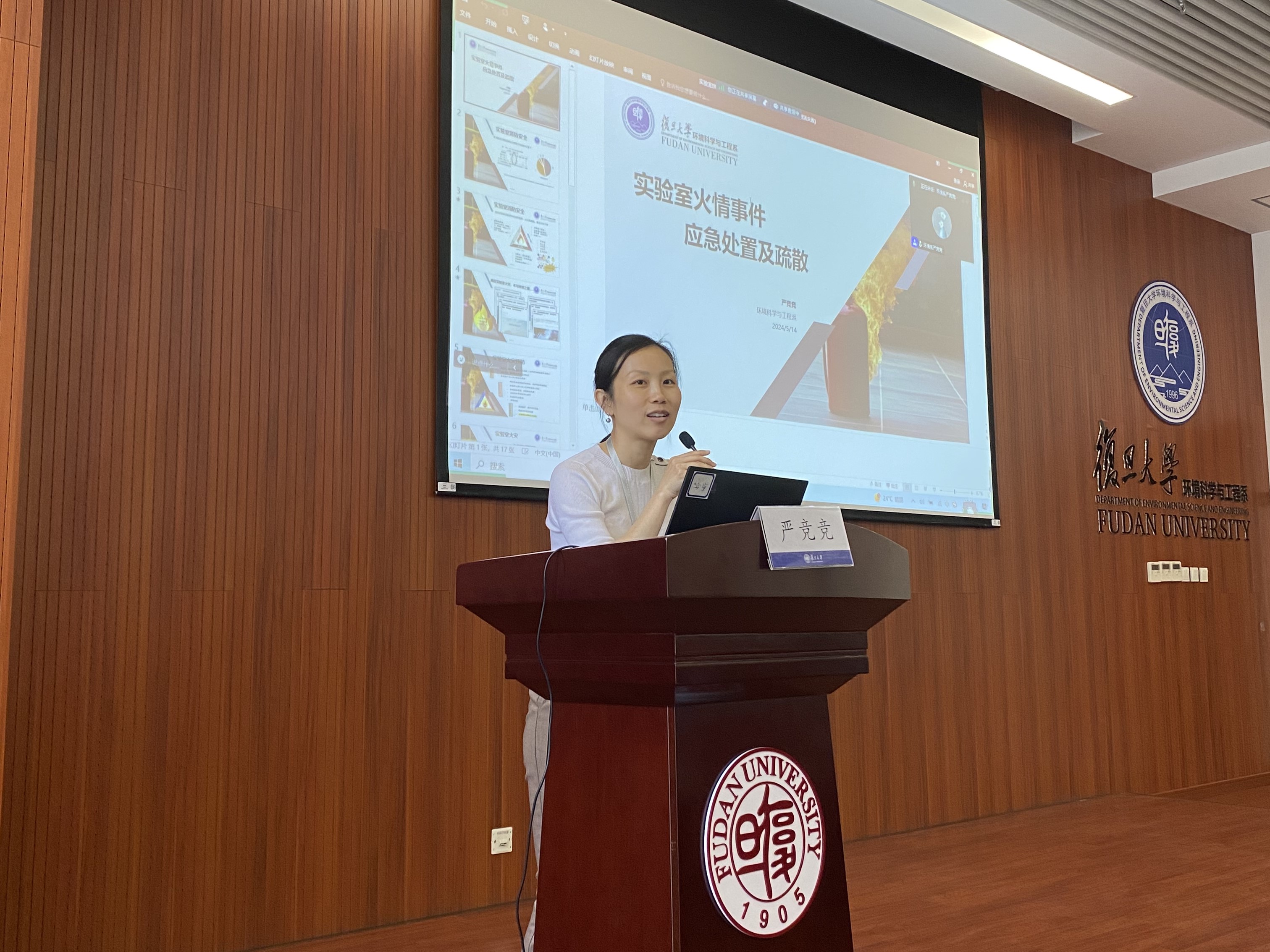 环境科学与工程系严竞竞博士对实验室火情事件应急处置及疏散做出讲解。严博士提示,高校实验室危险源种类多,火灾后果严重,应注重日常管理,积极开展演练,才能在火情发生时保持镇静,做到及时报告及有效应对。