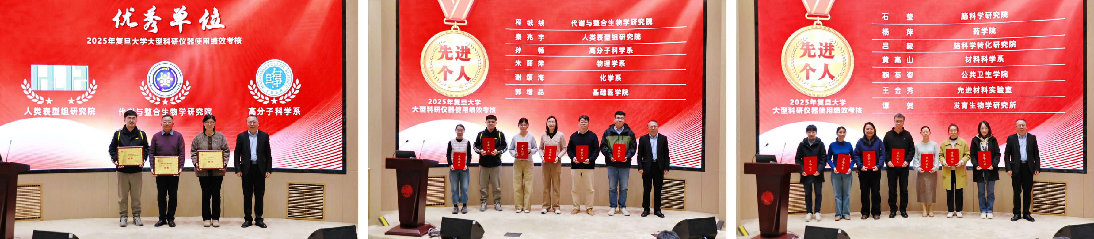 张威处长宣读我校获上海市大型科学仪器设施共享服务先进个人名单、2025年校内大型科研仪器使用绩效考核结果、大型科研仪器共享服务成效典型案例大赛评选结果以及大型科研仪器实验技术课题的立项结果。本年共有28家单位、781台仪器参与考核,经过专家评审和现场核查,评选出3家优秀单位、10家良好单位、13名年度共享工作先进个人和73台优秀仪器;评选出校内外服务获奖案例16项,设立实验技术课题10项。汪源源副校长为在考核中获得优秀的单位及先进个人颁奖,科学技术研究院刘茂龙处长为共享服务典型案例大赛获奖人颁奖。