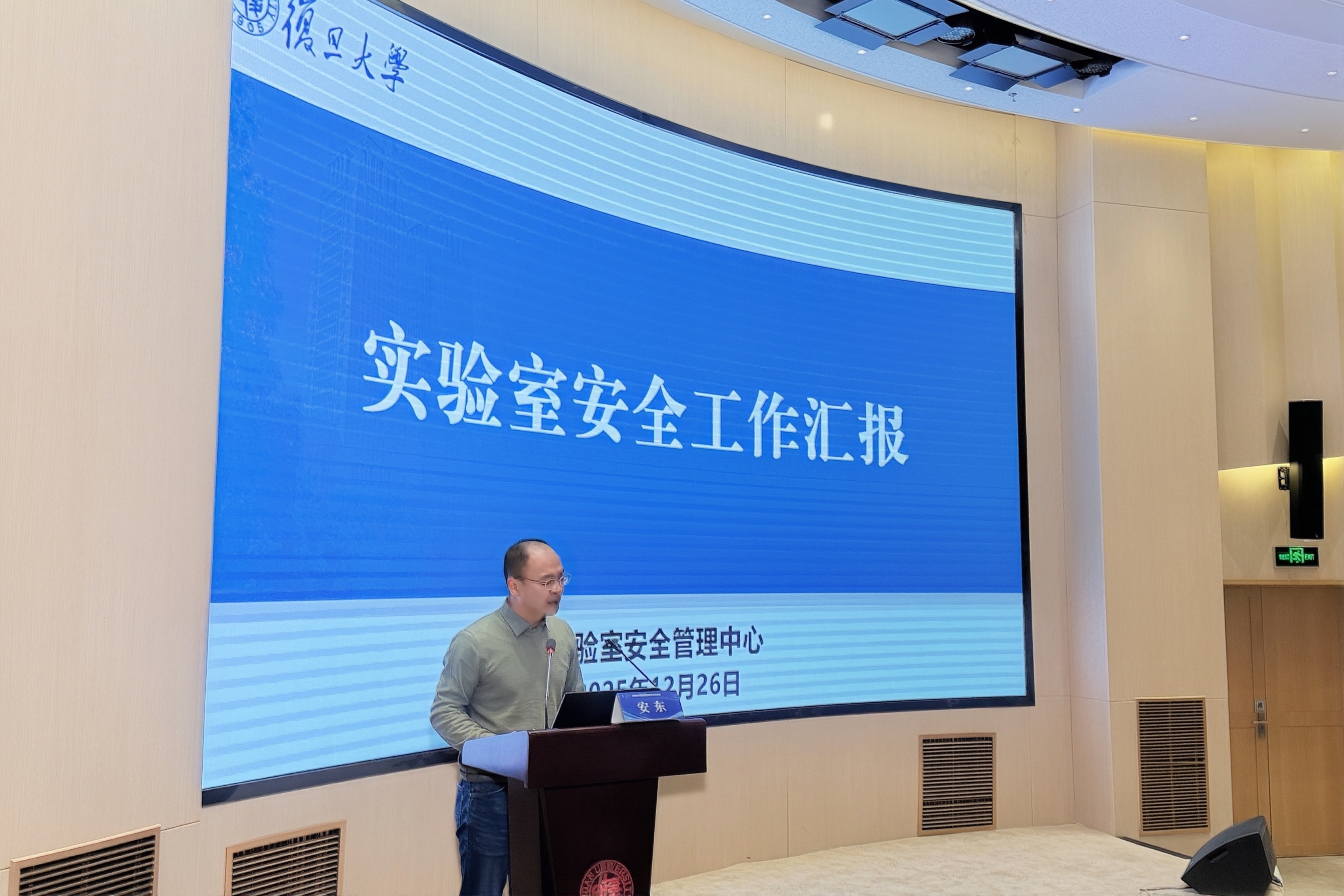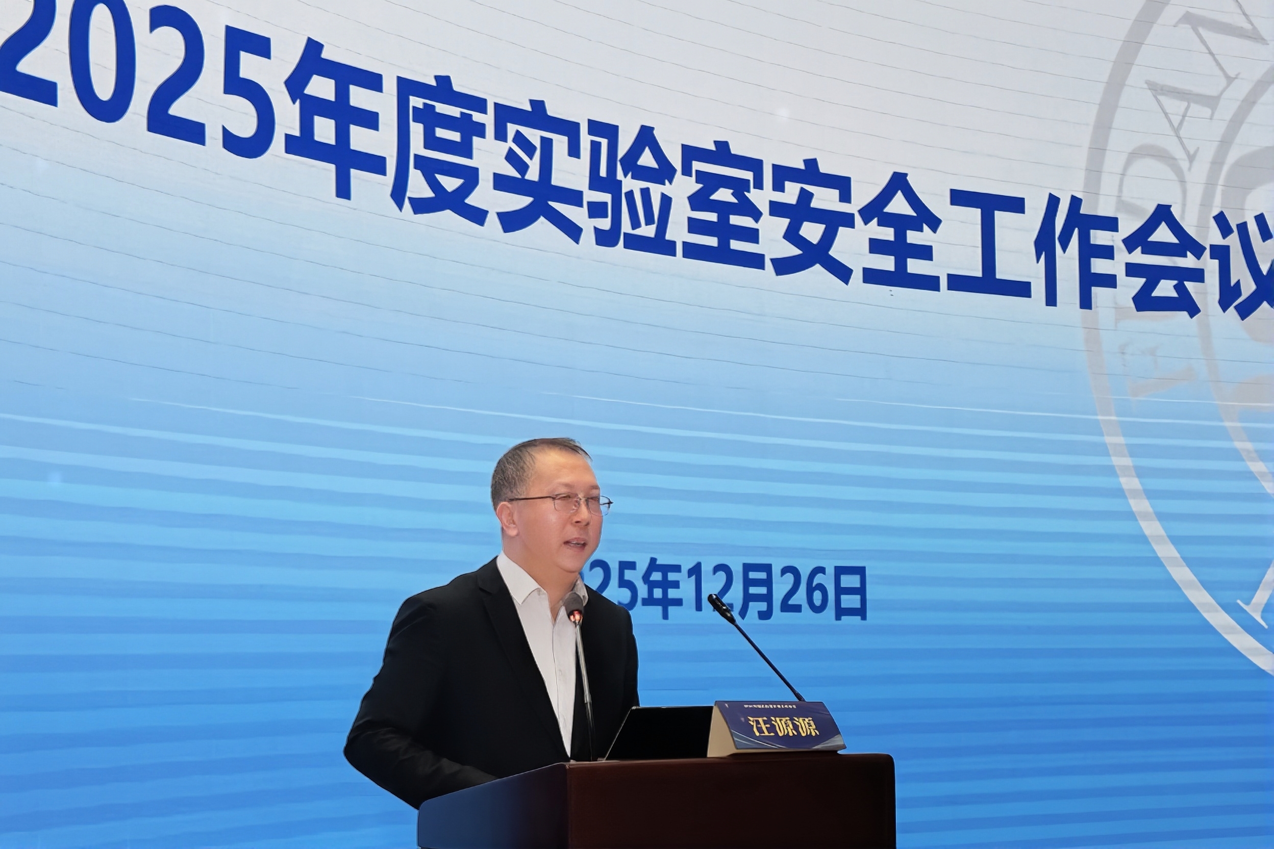 2025年12月26日下午,复旦大学2025年度实验室安全工作会议在逸夫楼一楼报告厅召开。校党委常委、副校长汪源源,实验室安全工作组成员,二级单位负责人、安全员及部分实验室负责人代表等110余人出席。会议由实验室安全管理中心主任张威主持。