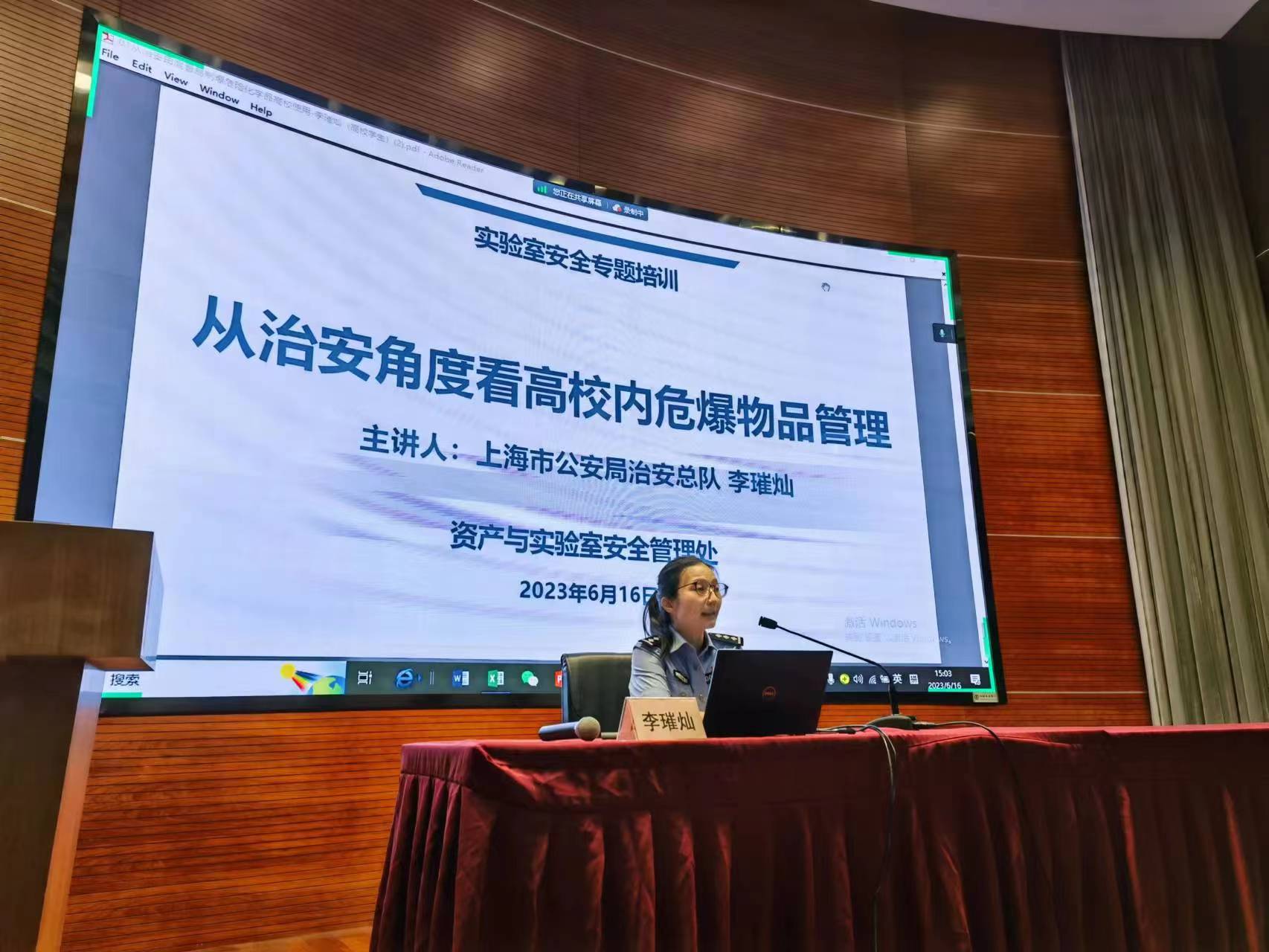 同日,上海市公安局治安总队危爆物品安全监管支队副大队长、爆炸防控专业警务技术二级主管李璀灿,应邀为师生带来一场题为“从治安角度看高校内危爆物品管理”的专题培训。